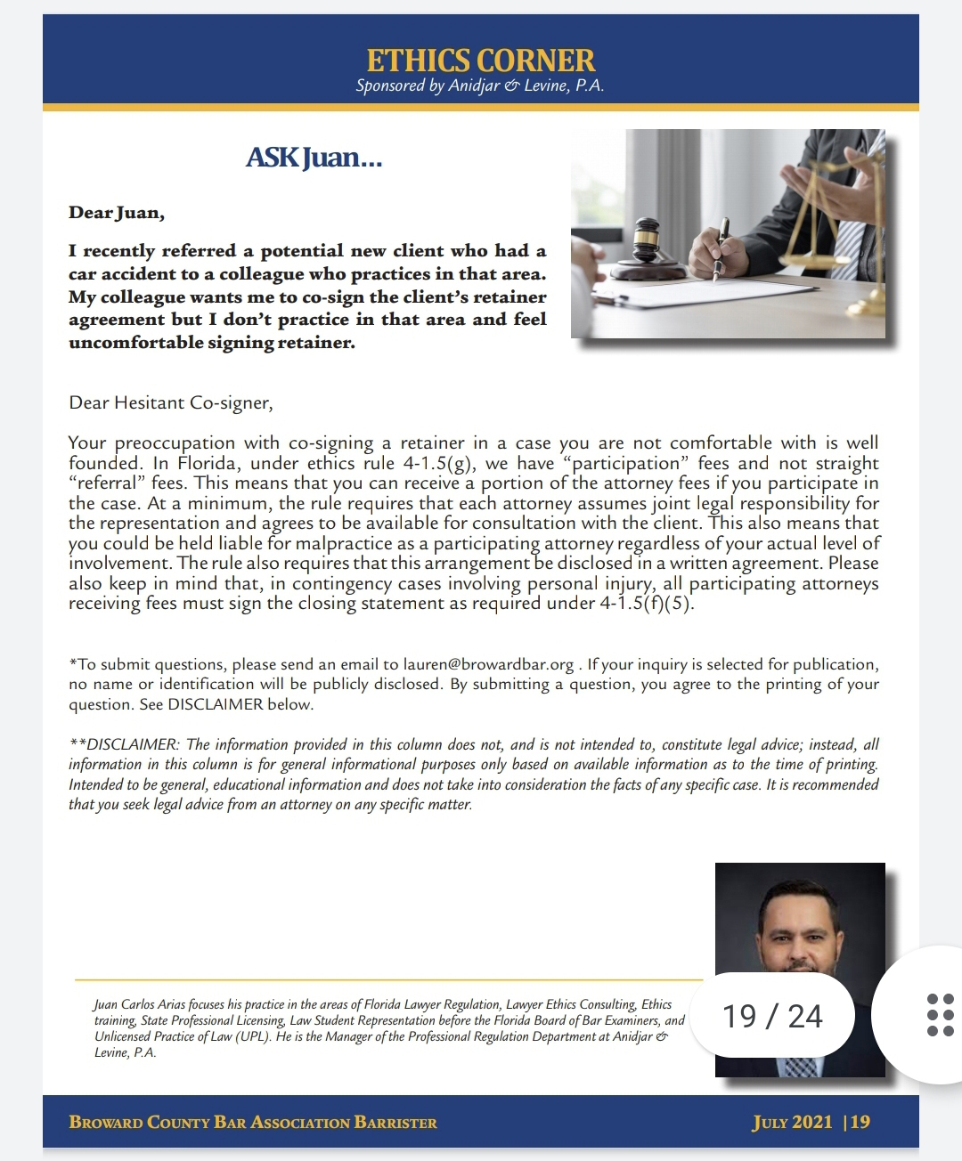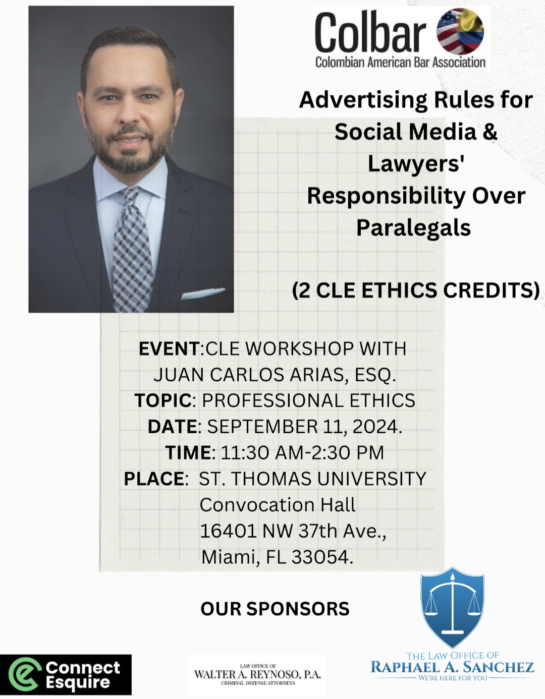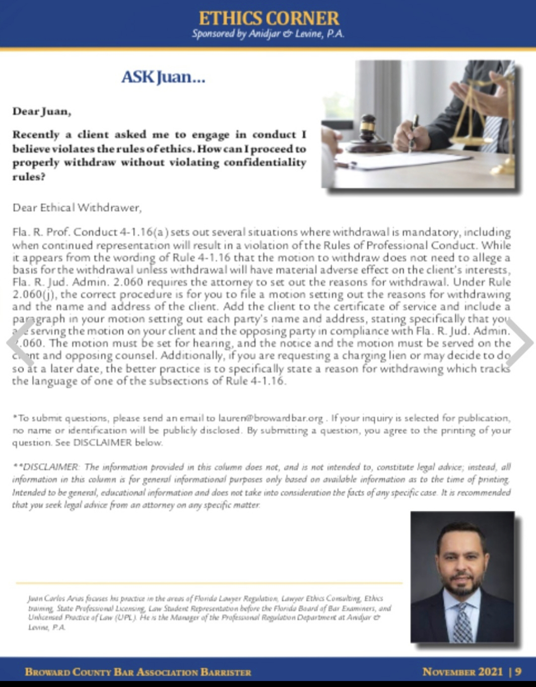 Juan Carlos is a member of the Association of Professional Responsibility Lawyers (APRL) and has served in the board of directors of three outstanding non-profit organizations: Legal Aid Services of Broward County/Coast to Coast Legal Aid of South Florida, Inc. (www.LegalAid.org); Hispanic Unity of Florida, Inc. and as Chairman of the Sheriff’s Foundation of Broward County, Inc. (www.Sheriffsfoundationofbroward.org). He also served on the Seventeenth Judicial Circuit Professionalism Panel. He is a past-president of the Broward County Hispanic Bar Association and is the proud recipient of the Broward County Young Lawyers’ Association 2009 Paul May Young Lawyers Section Professionalism Award. Juan Carlos frequently lectures in the area of lawyer regulation at CLE programs sponsored by voluntary bar associations and private law firms.