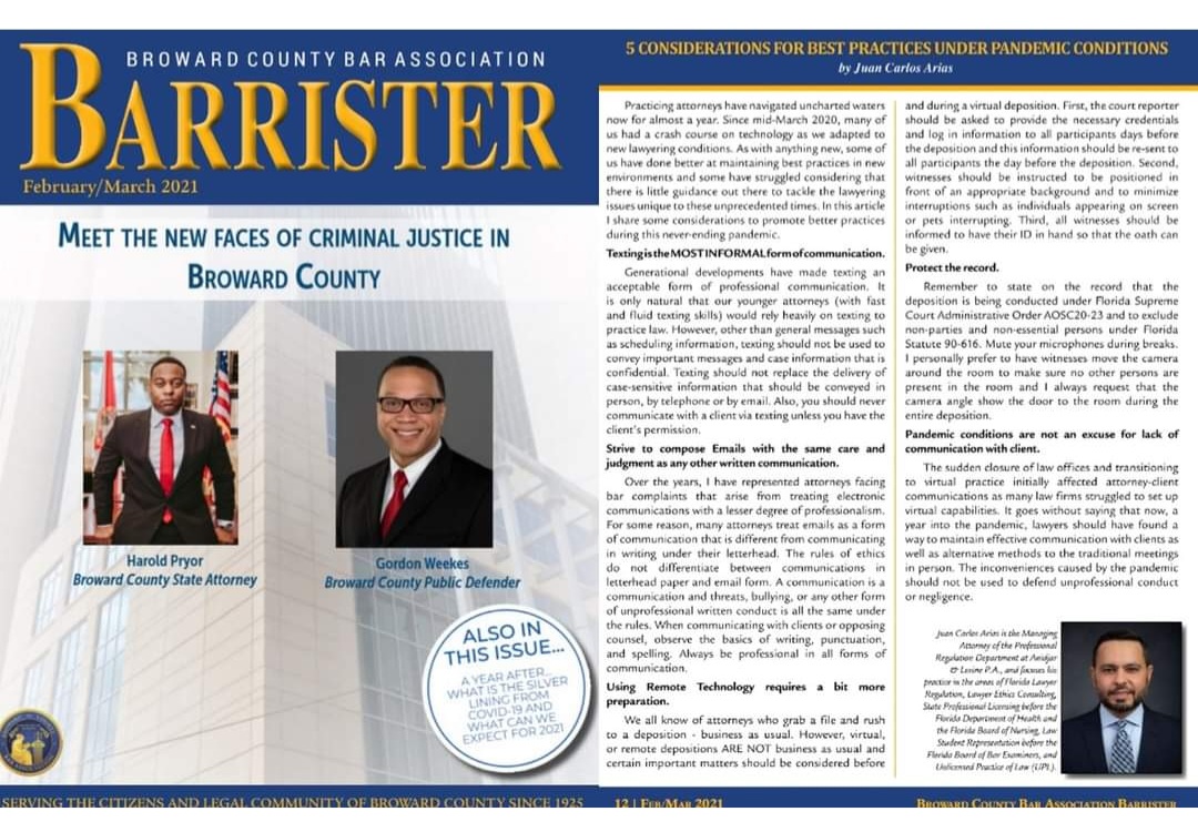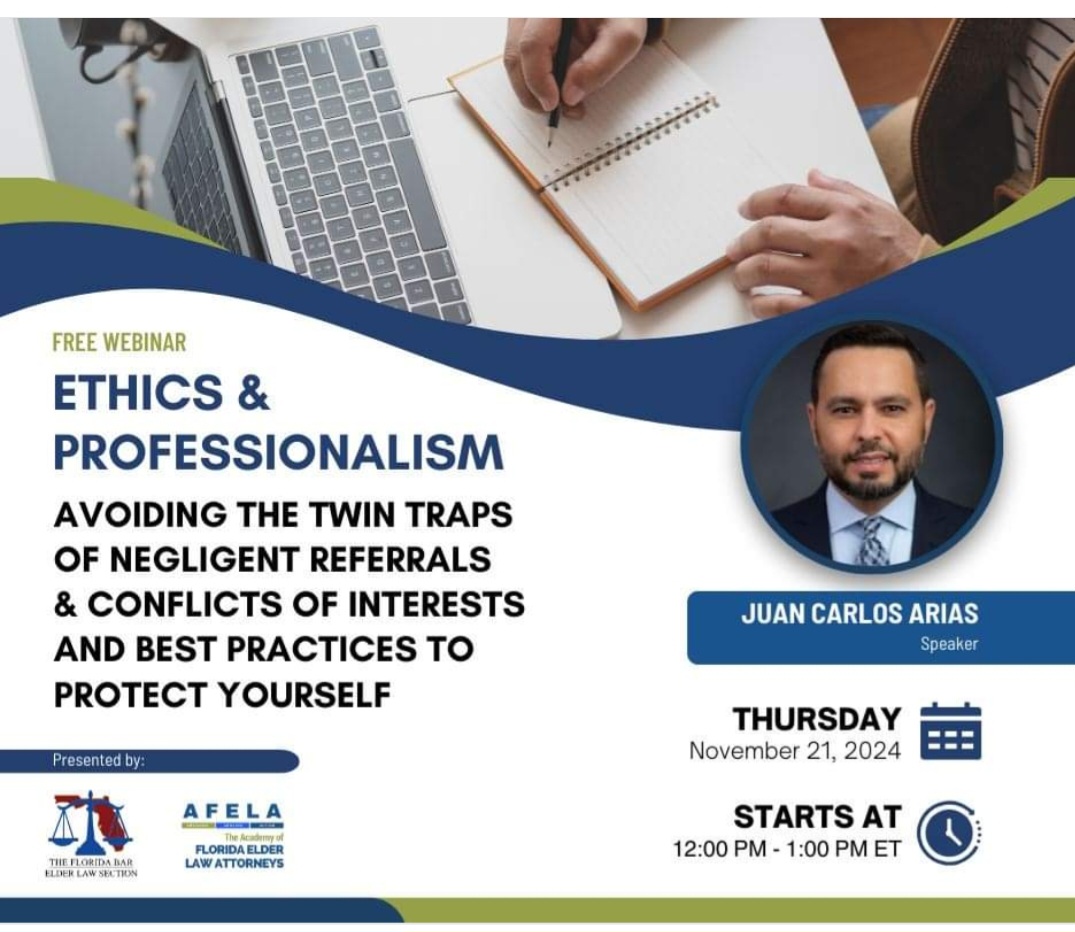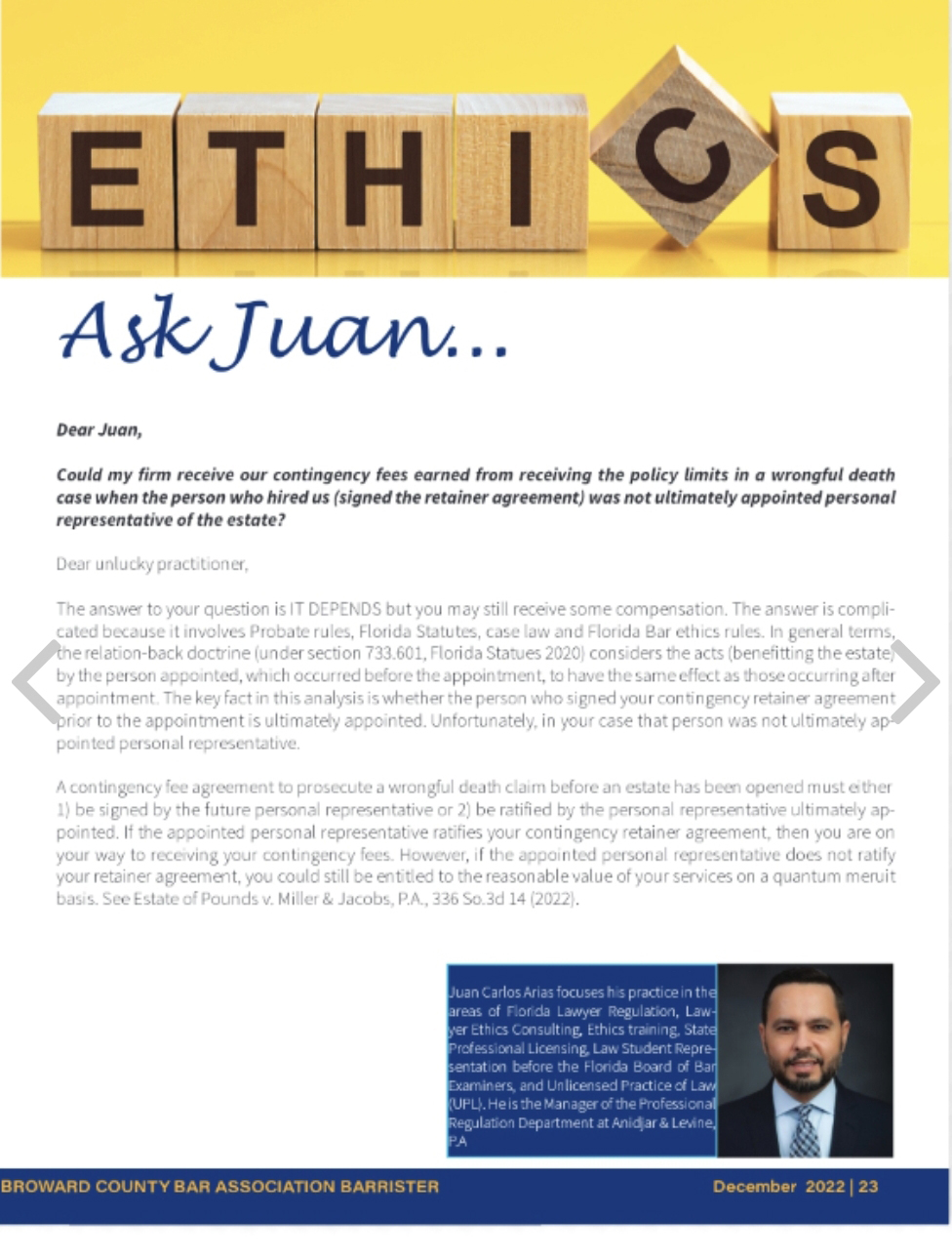 Juan Carlos is a member of the Association of Professional Responsibility Lawyers (APRL) and has served in the board of directors of three outstanding non-profit organizations: Legal Aid Services of Broward County/Coast to Coast Legal Aid of South Florida, Inc. (www.LegalAid.org); Hispanic Unity of Florida, Inc. and as Chairman of the Sheriff’s Foundation of Broward County, Inc. (www.Sheriffsfoundationofbroward.org). He also served on the Seventeenth Judicial Circuit Professionalism Panel. He is a past-president of the Broward County Hispanic Bar Association and is the proud recipient of the Broward County Young Lawyers’ Association 2009 Paul May Young Lawyers Section Professionalism Award. Juan Carlos frequently lectures in the area of lawyer regulation at CLE programs sponsored by voluntary bar associations and private law firms.